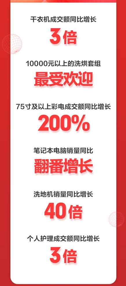 在新居、换新,以及梅雨季来临等多重因素的刺激下,京东五星电器干衣机成交额同比增长3倍,10000元以上的洗烘套组深受消费者欢迎。在欧洲杯等赛事观看的刺激下,75寸及以上彩电成交额同比增长200%。随着高考结束,手机电脑等3C产品销量迅猛增加,其中笔记本电脑销量实现翻番增长。在父亲节等节日因素的刺激下,个人护理成交额同比增长3倍。