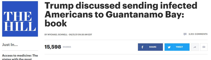 报道称,2020年2月,在白宫战情室的一场会议上,官员们正在讨论是否把在海外感染新冠的美国人接回本土治疗,特朗普当时在会上问道:“我们不是有自己的岛屿吗?”“关塔那摩怎么样?”