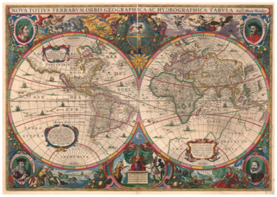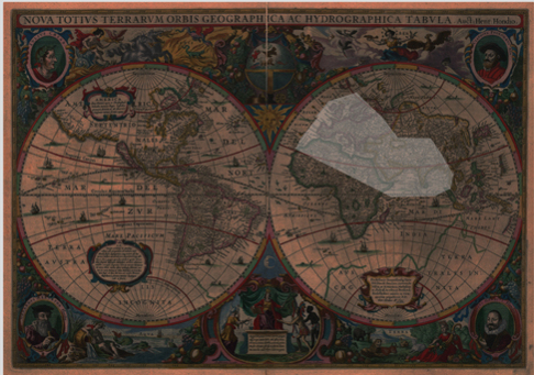 这张地图非常华丽,色彩也丰富,可见赫哈德斯绘制它的时候,人类对地球的了解已是如此之多。图5浅色部分就是托勒密所认知的世界。新地图展现的世界面积更大了,有了浩瀚的海洋。最令人激动的是,它被画成了两个圆。因为只有这样,才能展示出地球的两面,如今我们都知道了这一事实。图中包含了北美洲和南美洲,虽然这里早已有人生活和居住,但之前一直不为外界所知。更重要的是,图中画出了太平洋和大西洋。可见这张地图与之前的地图完全不同。