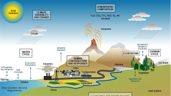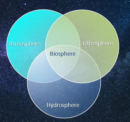 图12:生物圈、大气圈、水圈、岩石圈的交织。生物圈(biosphere):地球表层中生物栖居的范围,包括生物本身以及赖以生存的自然环境;大气圈(atmosphere):包围地球的空气层,由氮气、氧气、二氧化碳、水汽、氩、氦及其他稀有气体组成;水圈(hydrosphere):地球上水的总称,包括海洋、河流、湖泊以及地壳中的所有水;岩石圈(lithosphere):固体地球的最外层,由地壳和上地幔的岩石所组成。