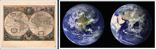 没有哥伦布、麦哲伦、哥白尼等科学家,人类就不会有现代科学文明。这一点我非常确信。“第二个地球”图引发了人类历史上的一次革命。人类历史上首次将地球看作一个整体。几个世纪以来,除了少数长途迁徙的移民,人类的眼界一直囿于“第一个地球”图(图5右图)。“第二个地球”图展示了地球上更多的自然奇观和丰富的自然资源,在这些新大陆上诞生了美国、加拿大、巴西、阿根廷等国家。如今,“第二个地球”图已被太空照片所证实。