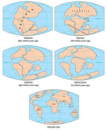 1912年,德国人阿尔弗雷德·魏格纳提出了大陆漂移学说。他画了几张地图展示了大陆本身是如何随时间变化的(图17)。陆地漂移对人类和其他物种来说的后果是什么? 我建议各位研究、阅读并了解其对历史的意义。