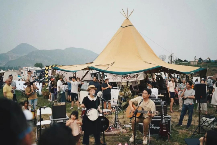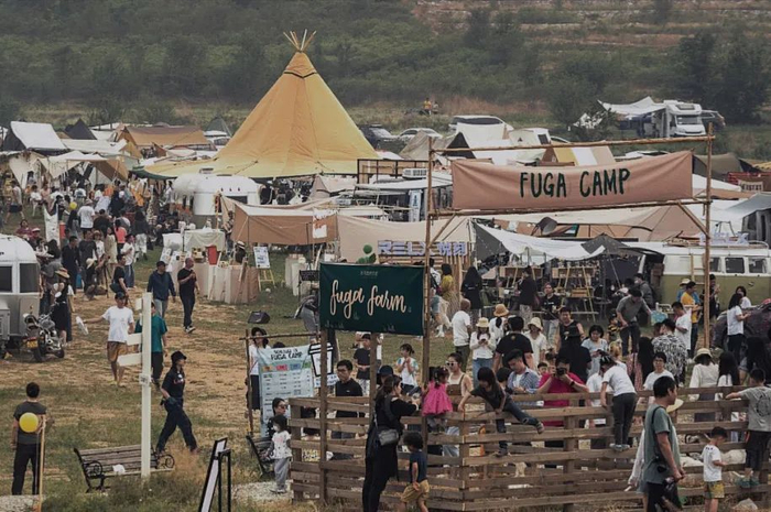 在刚刚结束的5月,距离北京国贸CBD 七十五公里的韩村河镇,举办了一场声势浩大的万人露营活动。这场取名Fuga Camp的聚会,被主办方称作“一座仅存在三天的理想小镇”,宣称要为想要逃离都市的人制造一个梦。活动所在的“北京天开自然营地”,也被其官方媒体标记为“中国Glamping风格露营文化的发源地”。