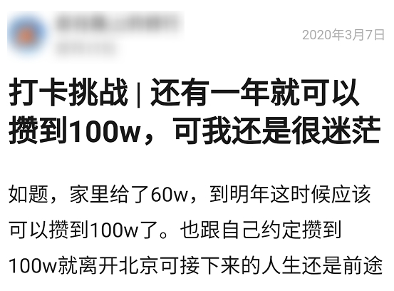 而有的帖子把我整无语了:还有一年就可以攒到 100W ,可我还是很迷茫。点进去一看,哦家里给了 60W 啊那没事了,炫富的滚出克嗷。