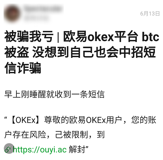 而在被骗我亏专栏里,有人收到疑似欧易平台的风险提示短信,点进网址输入密码,然后 BTC 直接被骗子一扫而空。