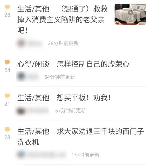 发帖主要围绕着劝退展开:当你有购物欲望的时候不妨逛逛这个小组,从服饰鞋包到数码电器,热心的网友总能帮你省下一笔开销。