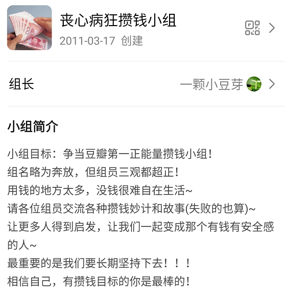 如果说丧心病狂亏钱小组的各种骚操作让人直呼下饭,那么它的好兄弟丧心病狂攒钱小组无疑是励志的典型:财务自由是这个神奇小组的唯一目标。