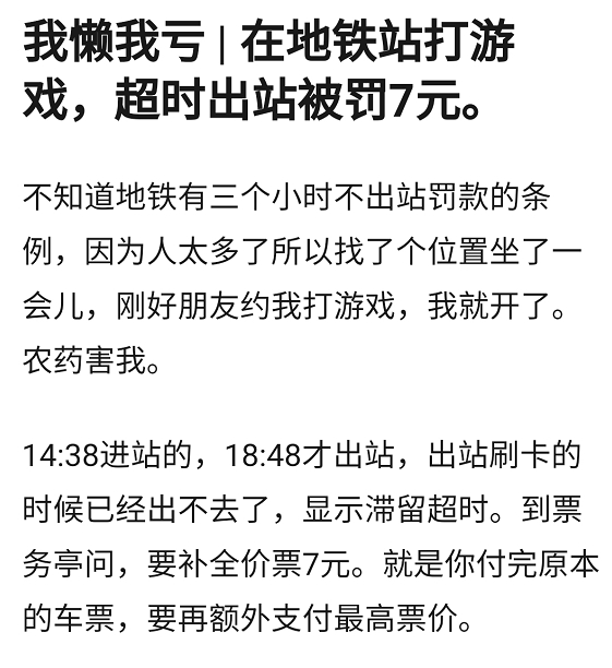 遛了一圈下来我感觉都可以写期人类奇葩行为大赏了。 有人在地铁沉迷打游戏出站花费7元巨款,顺便收获冷知识:地铁三小时不出站额外支付最高票价,而这一行为也成功被我懒我亏专栏收录。