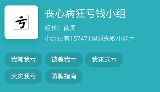 小组内分类直观明了,共有五大类:我懒我亏,被骗我亏,我花式亏,天灾我亏以及防骗指南。