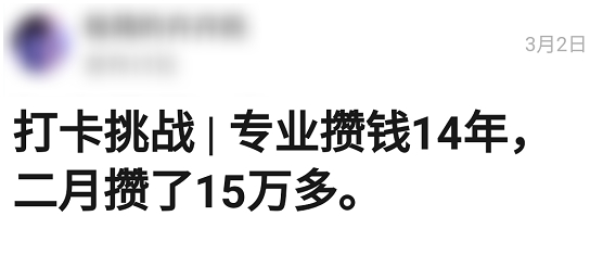 打卡挑战是组内的重头戏,在这个版块里你能看到无数的励志宣言:专业攒钱 14 年,二月攒了十五万多。