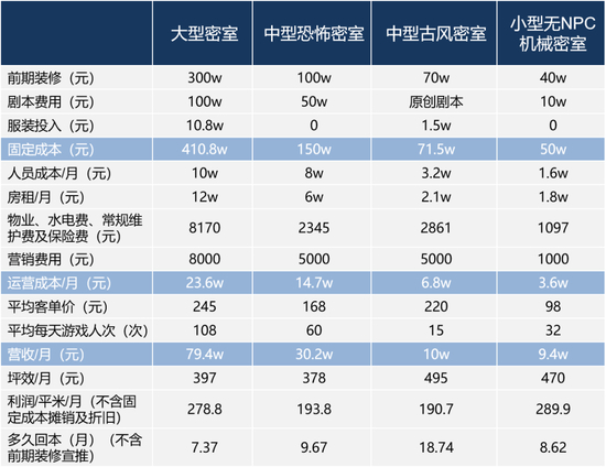 从坪效和利润来看,小型无NPC机械密室和大型密室的盈利能力最强,从回本时间上来看,这两种密室也是最快的。