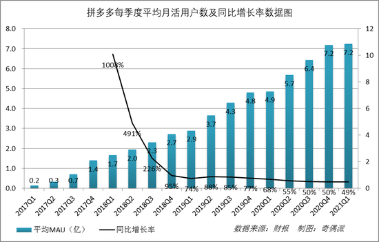 在具体的用户数据上,2021年一季度,拼多多年活跃买家数较上一年同期的6.281 亿净增1.957亿,同比增幅31%,环比净增3600万,环比增幅为4.57%。在月活数据方面,一季度,拼多多月活为7.25亿,单季度环比增长乏力,环比增长500万,增幅为0.7%,同比增长2.38亿,增幅48.9%。