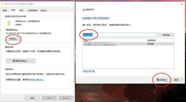 再次回到共享选项卡中,点击“共享……”,在后续菜单中继续选择“Everyone”,然后选择“共享”。此时,我们就已经完成了电脑端的配置工作。