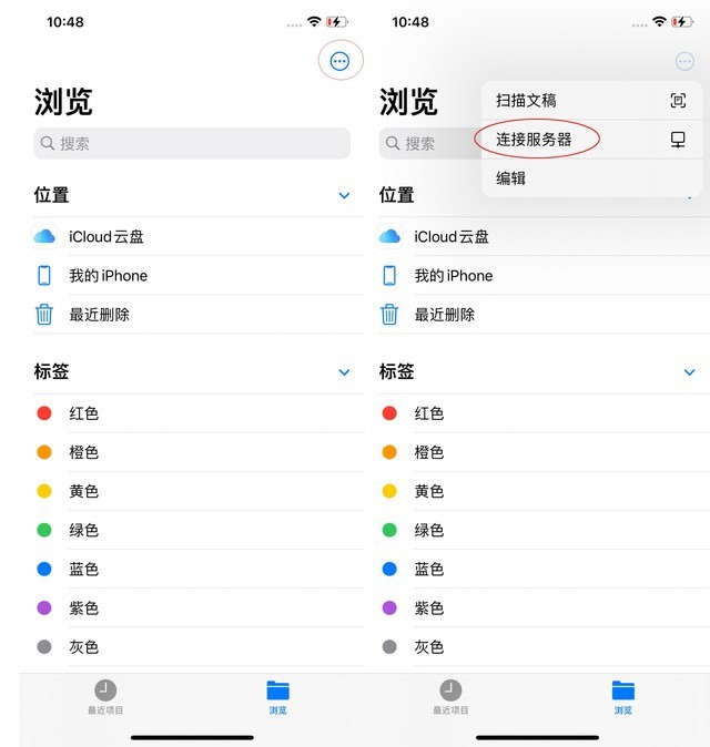 以上是电脑端的配置方式,接下来就是手机端的操作了。以iPhone 12 Pro为例,在iPhone上,首先找到文件APP,在“浏览”界面上方有三个小点,点开后可以看到“连接服务器”选项。