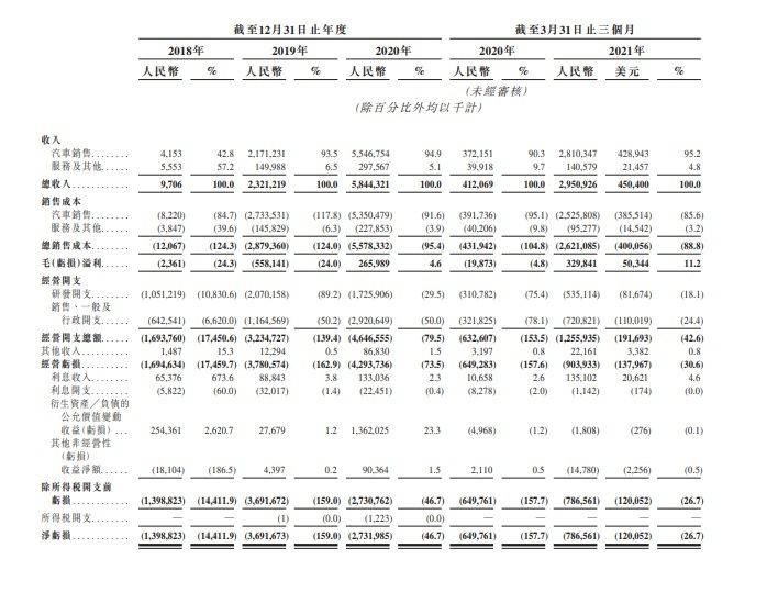 在小鹏汽车公司6100多名员工中,有40%是研发人员。而自2018年至2020年及今年第一季度,小鹏汽车研发开支分别为10.51亿元、20.70亿元、17.26亿元及5.35亿元。在2019年、2020年及今年第一季度,研发开支分别占总收入的89.2%、29.5%及18.1%。
