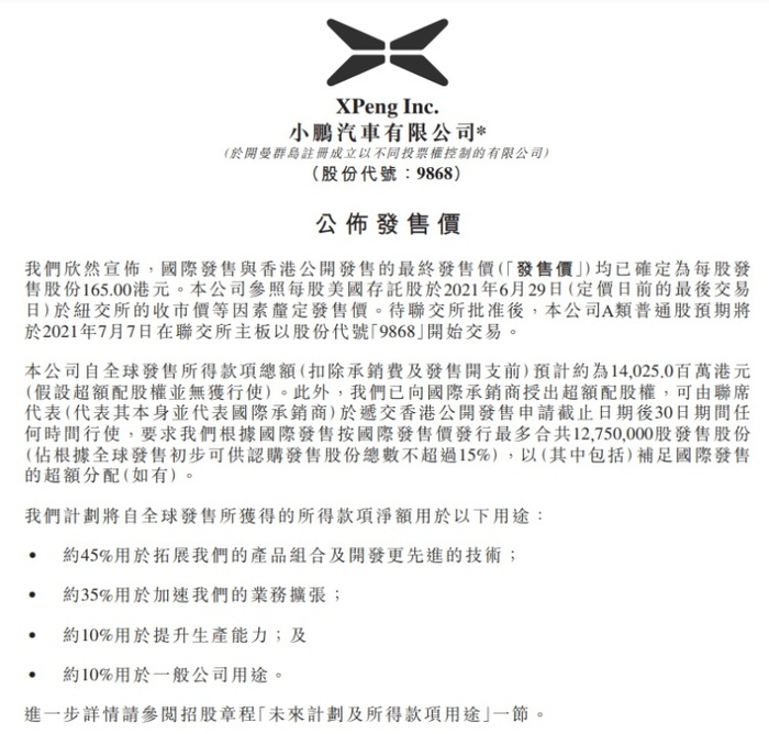 小鹏汽车最新的公告显示,小鹏汽车已将香港IPO的指导价定在165港元/股。按照这一定价,小鹏汽车拟在香港上市交易中募资约140亿港元,与去年在美股上市募资的金额差不多。