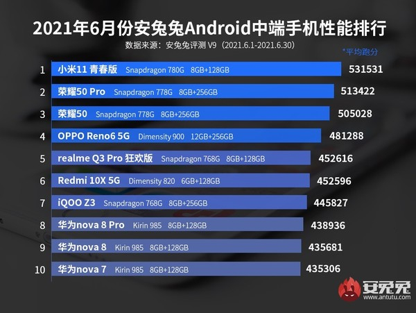另外,由于6月发布了多款中端机型,因此安兔兔的中端机性能榜有了些许变化。排名第一的机型为小米11青春版,该机搭载骁龙780G,平均成绩为531531。排名第二第三的则是近期发布的荣耀50系列,两者均搭载骁龙778G,该平台拥有A78大核心加持,性能表现可圈可点。
