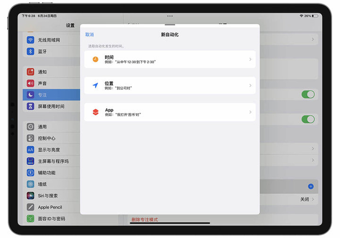 不过,每次都主动去开启的话,总会出现‘我过一会再学习’的想法,然后在游戏和视频中迷失自我。iPadOS 15 提供了两种自动开启专注模式的方式:行为触发和自动开启。