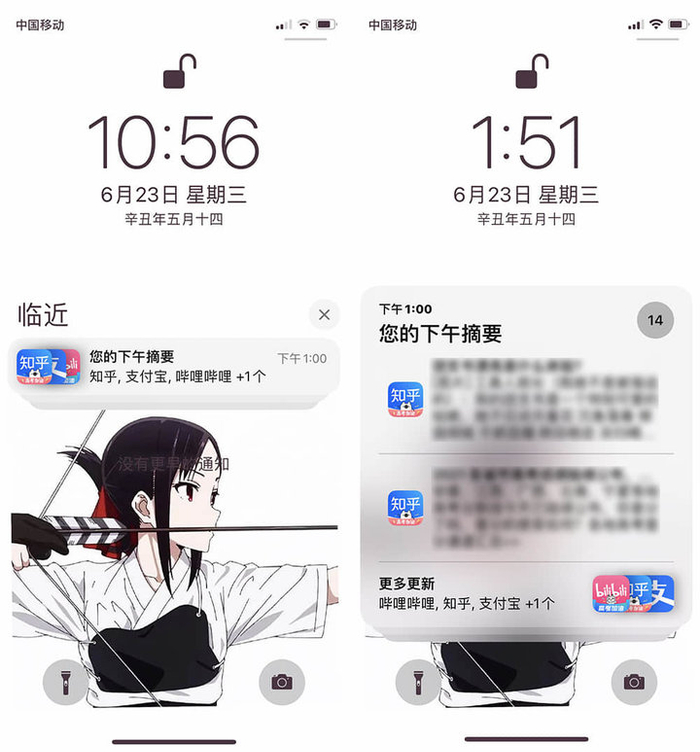 定时推送摘要并不是收不到通知,只是在推送时不会亮屏、响铃。当你在未推送的时间段拿起手机时,还是会看到这些 app 的推送被整合为‘您的 XX 摘要’,点击即可查看。到了时间,这些 app 就会根据你使用习惯,把最重要的内容在顶部大图显示,方便你快速浏览。
