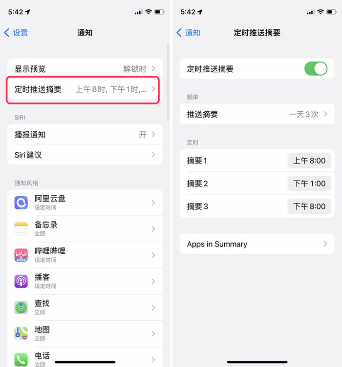 在‘设置> 通知> 定时推送摘要’中,我们可以把不需要实时查看的 app 加入其中,并对它们的推送时间、次数进行设定。以我为例,我把哔哩哔哩、播客、信息、支付宝、知乎等常用但没必要实时推送信息的 app 加入定时推送的库中,并设定每天早 8 时、午 1 时、晚 8 时进行推送。