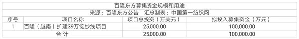 第一纺织网据公告获悉,百隆(越南)扩建39万锭纱线项目总投资2.50亿美元,拟使用募集资金10亿元,实施地点位于越南西宁市福东工业园,实施主体为公司全资子公司百隆(越南)有限公司。