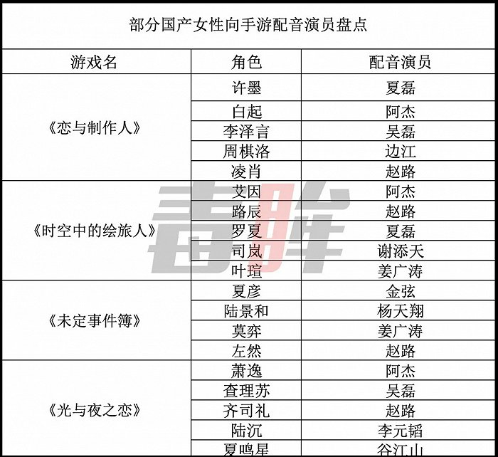 毒眸盘点了市场上部分国产女性向手游发现,该类含有大量语音台词的游戏在配音演员的选择上,已经出现了高度的同质化现象。阿杰、夏磊、赵路、吴磊等配音演员成为手游配音的常驻嘉宾,赵路甚至可以拿下“全勤奖”。