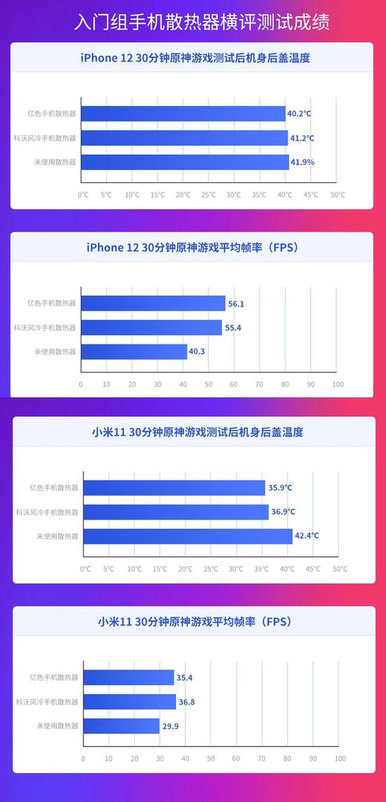 在散热效果方面,在历经30分钟游戏测试后,在使用科沃风冷手机散热器进行辅助散热的情况下iPhone 12和小米11的机身后盖温度分别降低了0.7℃和5.5℃,游戏帧率分别能够达到55.4帧和36.8帧;使用亿色手机散热器则能够实现iPhone 12和小米11的机身后盖温度分别降低1.7℃和6.5℃,游戏帧率则分别为56.1帧和35.4帧。