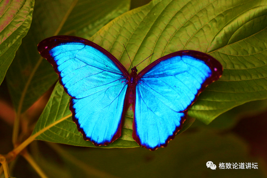 下图是大蓝闪蝶,颜色非常鲜艳,这种颜色像镜子一样照射到动物的眼睛上,尤其是鸟类,通过这种方式把小鸟晃晕,小鸟就落荒而逃了。