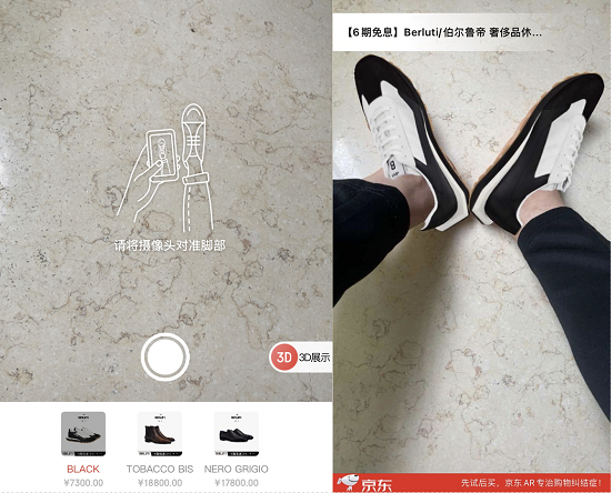 目前,AR智能试穿功能已在Berluti京东官方旗舰店试水上线,先行提供几款经典鞋款的智能试穿服务。顾客只需将手机摄像头对准脚部,即可尽情感受鞋履上脚效果,全程体验流畅且真实;点击3D展示按钮,更可360°翻转查看鞋面及鞋底细节。后续Berluti京东官方旗舰店还将为更多产品实现AR化,致力于为顾客打造置身店中的试穿效果。