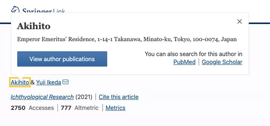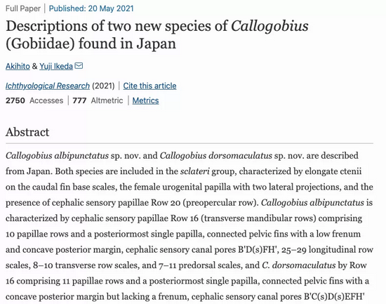 今年5月,在英文期刊 Ichthyological Research 上出现了一篇奇怪的论文,这篇论文描述的是两个新的虾虎鱼物种。这并没有什么奇怪之处,但是这篇论文的第一作者没有署姓,只有一个名:Akihito。