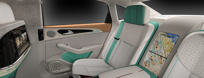 敦煌版的内饰配色十分个性,中控台和车门内饰板的上部位置是金色,下部是浅灰色,在车门内饰板以及座椅等位置使用了松石绿面料进行点缀,在中控台以及后排中央扶手箱等位置还带有敦煌壁画标志性的装饰图案。