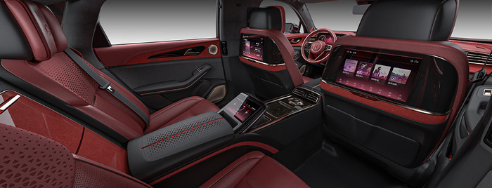 故宫版的内饰也是和外观相呼应的红黑配色,在细节部分将会使用在红旗L5上使用的沈氏大漆风格的装饰。从目前的信息来看,加长版的红旗H9+都是采用2+2的4座布局,后排除了电动调节的座椅,还提供了多块大屏等配置。
