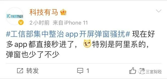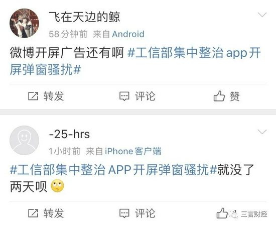 针对网友反映的头条、微博、百度还有开屏广告的情况,三言财经也进行了验证。
