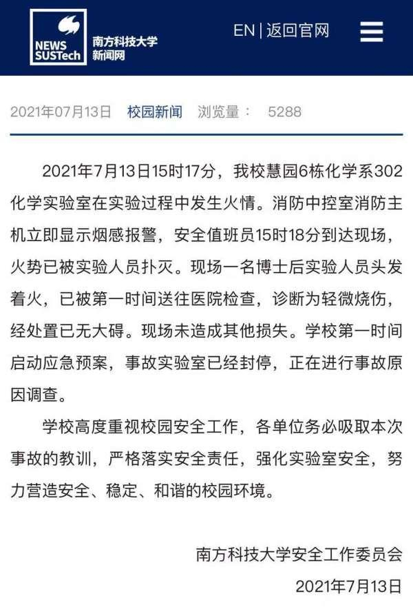 南方科技大学安全工作委员会当日在该校官网通报称,2021年7月13日15时17分,该校慧园6栋化学系302化学实验室在实验过程中发生火情。消防中控室消防主机立即显示烟感报警,安全值班员15时18分到达现场,火势已被实验人员扑灭。