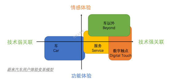 车是“地基”,从技术角度上看,“三电技术”就被划分在这个象限里;服务和数字触点是“楼体”,主要满足功能需求和部分情感需求;而服务部分,已经成为了蔚来汽车的标签。