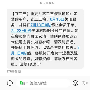 日前,共享租衣平台衣二三给自己的用户们发送了一则短信通知,其中提到,衣二三将于2021年8月15日关闭服务,并将在7月13日停止会员下单,7月23日停止衣箱归还预约通道,8月1日起开启统一退还会员费及押金的通道。