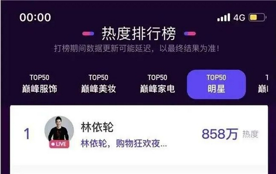 6月29日,淘宝直播联合淘榜单发布了今年天猫“6·18”的明星直播带货榜,林依轮排名第一,成为第一位跻身所有淘宝主播前五名的娱乐明星。