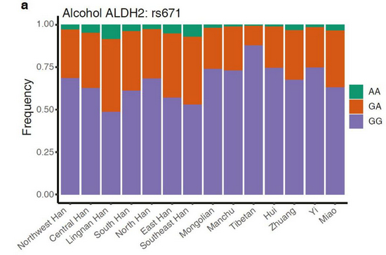 研究同时发现,中国北方人群的确比南方人能喝酒。因为,北方人群的ALDH突变较少,酒精代谢能力强于南方人群。各民族之间来看,藏族、蒙古族和彝族同胞的ALDH突变最少,解酒能力排名第一;而岭南和东南部的汉族人群酒量垫底。