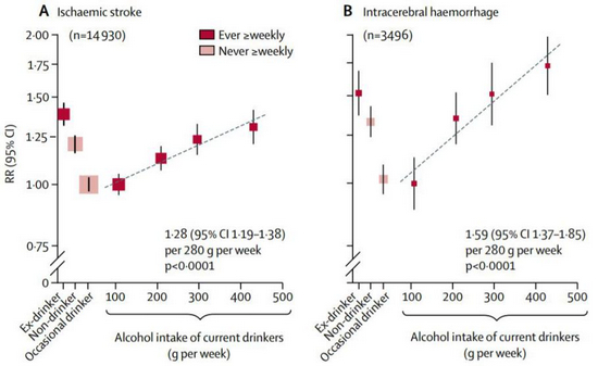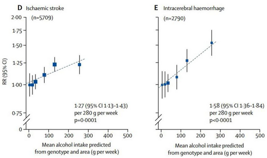 但是在遗传流行病学分析中,研究人员依据ADH和ALDH的基因型对中国人群重新分类,这种U型关联就消失了。男性适度饮酒对中风、脑出血或急性心梗没有显示出任何的保护作用,患病风险随着酒精摄入量的增多而稳步增加。女性中,ADH和ALDH变异与这些疾病并没有明显的关联。