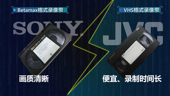 70年代后,家用录像机开始兴起,索尼推出了Betamax格式录像带,与JVC开发的VHS格式展开旷日持久的标准之战。索尼将科技树主要点在更清晰的画质上;而VHS的优势则是便宜、录制时间长。虽然媒体和专业人士都更偏爱索尼,可消费者用脚投票的结果,却是VHS获胜。