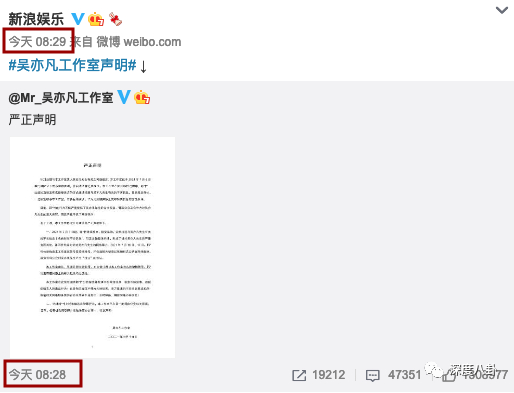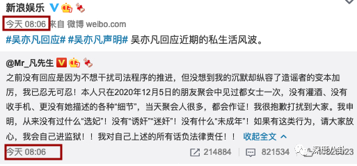 直到今天,吴亦凡个人和工作室再发所谓的辟谣消息和工作室声明。新浪娱乐都是在一分钟内完成转发。如果说双方没有提前打招呼沟通,这很难说服我。
