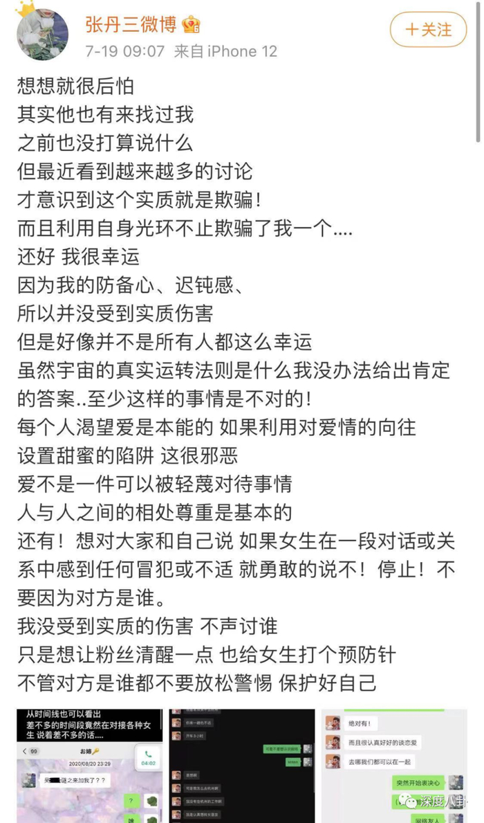 像偶像艺人团体、前SNH48成员“张丹三”这样发微博,利用自己的社会影响力发声,硬刚吴亦凡,更是可以的。