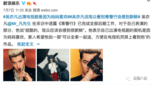 新浪娱乐官博,在替吴亦凡发该声明前,针对吴亦凡的上一条更新是,吴亦凡主演《青簪行》的宣传。31岁的凡凡还在塑造乖儿子的人设,说他出演电视剧的契机是:他妈妈喜欢看电视剧。