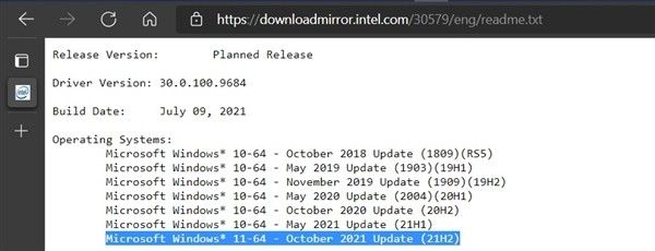 在英特尔DCH GPU驱动30.0.100.9684的发布说明中,Intel已经明确将Windows 11称为 “2021年10月更新--21H2版”。正如你可能知道的那样,Windows构建被标记为 “YYMM”,其中YY代表两位数格式的年份,MM是代表预期发布的月份。