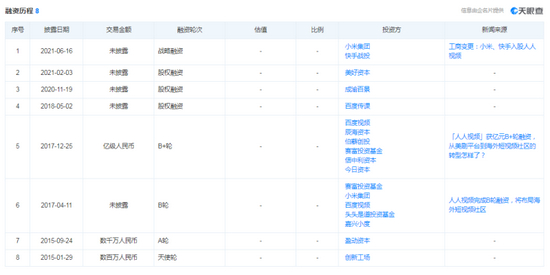 得益于平台的庞大用户群,人人视频颇受资本青睐。天眼查显示,截止目前,人人视频共获得八轮融资,投资方包括创新工场、今日资本、百度、快手、小米等知名创投机构及互联网巨头。公司最新一轮融资发生在今年6月,由小米集团、快手战投投资,投资金额尚未披露。