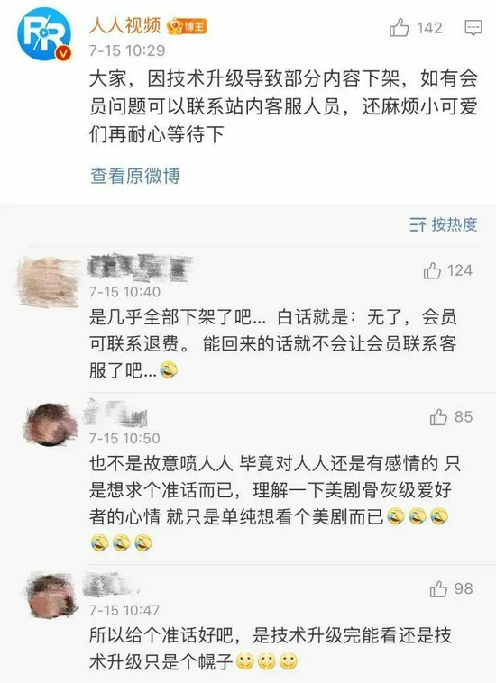 次日,人人视频在官方微博评论区回应称,“因技术升级导致部分内容下架,如有会员问题可以联系站内客服人员,还麻烦小可爱们再耐心等待下。”