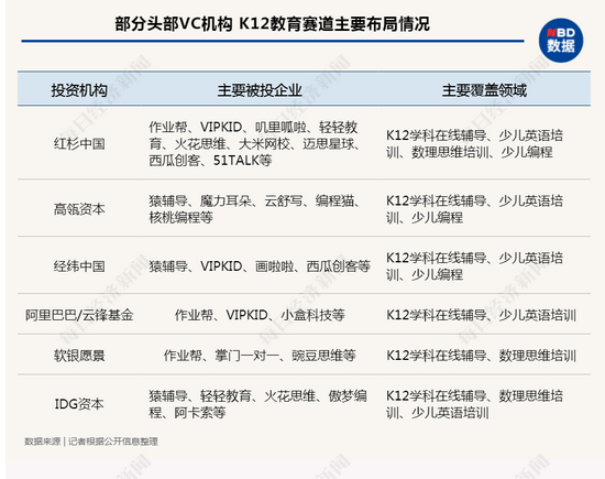 在过去的几年中,有超千亿的资本涌入K12教育,其中尤以头部VC最为活跃。《每日经济新闻》记者统计发现,过去数年里快速“跑出来”的K12教育机构背后,均有一线资本的身影。红杉中国、高瓴、经纬中国、软银愿景等“弹药充足”、试错空间大的头部VC们更是出手阔绰,估值领跑赛道的“独角兽”们几乎都出自他们之手。从投资偏好来看,不同的机构偏好各异,但K12在线辅导、少儿英语培训则是过去几年疯狂资本眼中绝对的“香饽饽”,几乎无人不投。