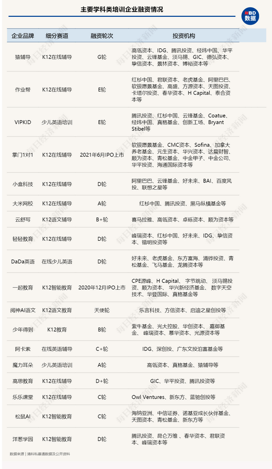 记者注意到,此次“双减”政策落地后,上市企业新东方、好未来、高途等公司均公告称,《意见》的出台将对公司的经营业绩和前景产生不利影响;猿辅导、网易有道等机构也通过官方微博回应称,将深刻认识“双减”重大意义,主动对标“双减”工作要求,严格执行相关规定。