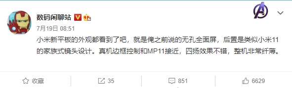 此外,数码博主 @数码闲聊站 还表示,该机后置是类似小米 11 的家族式镜头设计,边框控制和华为 MatePad 11 接近,采用四扬声器,音响效果不错,整机非常纤薄。