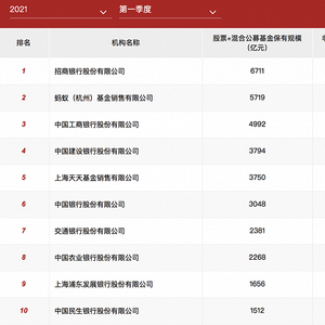 三家机构的非货币公募基金保有规模超过5000亿元,分别是招商银行8901亿,蚂蚁基金7079亿和工商银行5366亿;建设银行、天天基金、中国银行保有规模均超过4000亿。